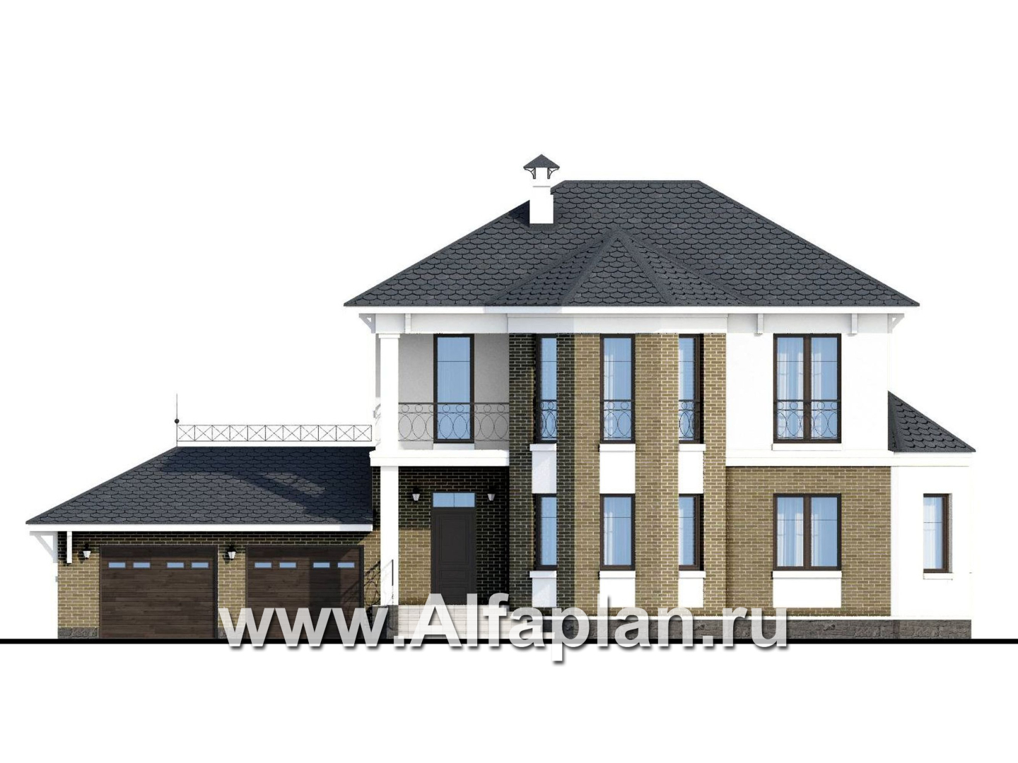 «Классика» - проект двухэтажного дома с эркером, планировка с кабинетом на 1 эт и с террасой, с гаражом на 2 авто