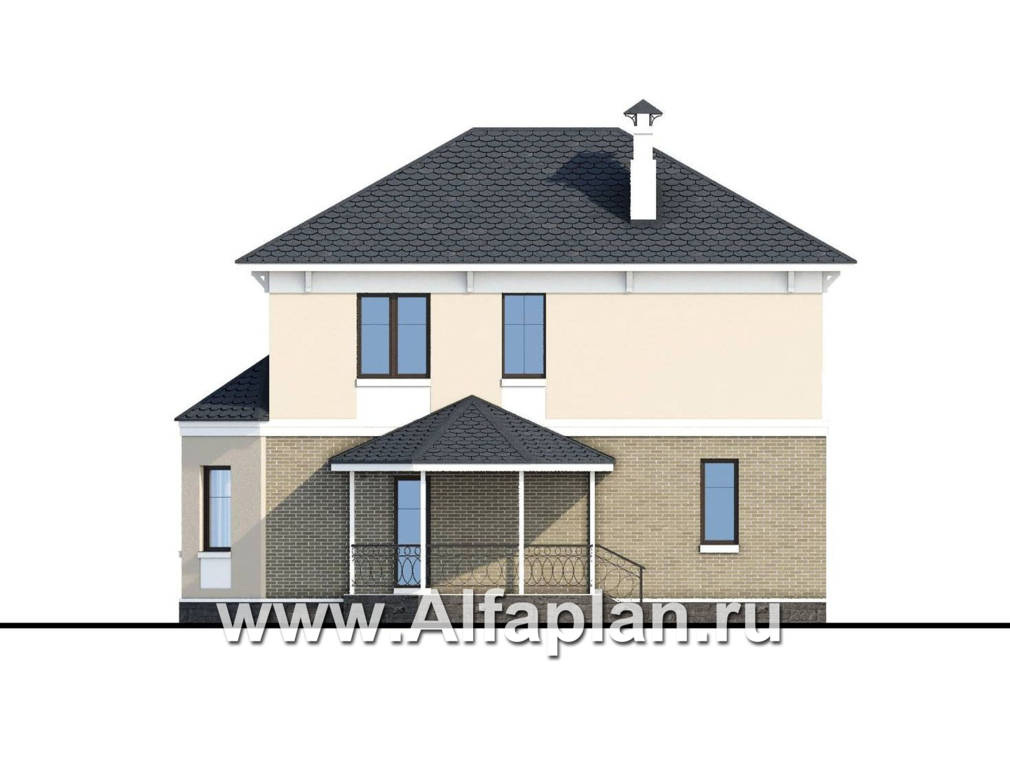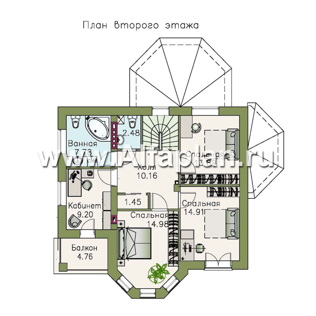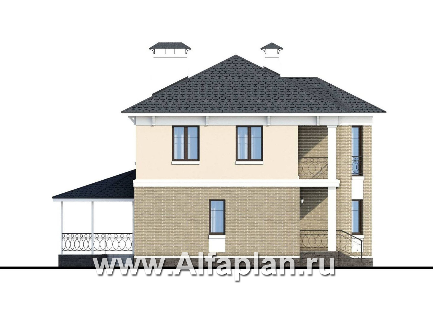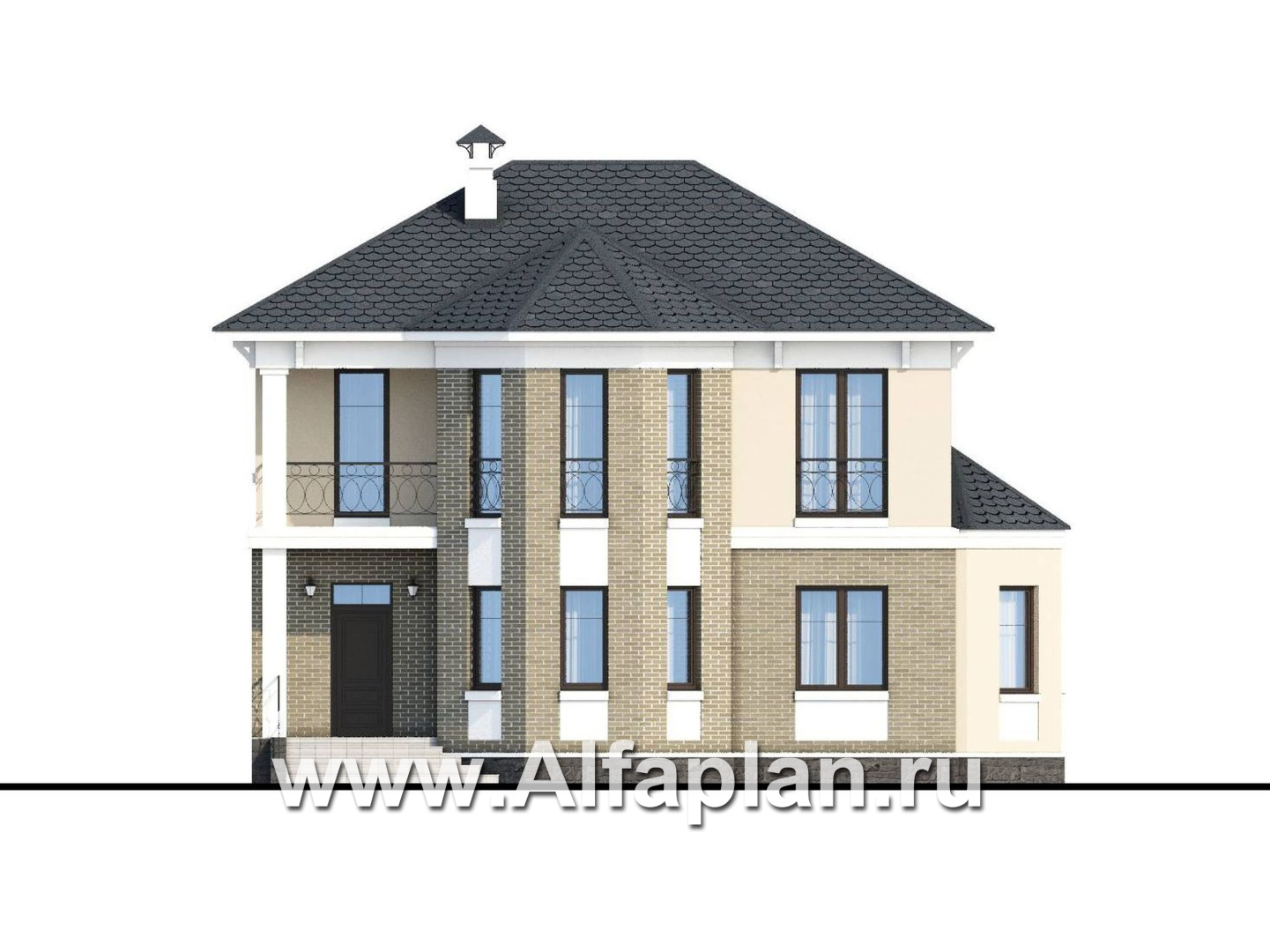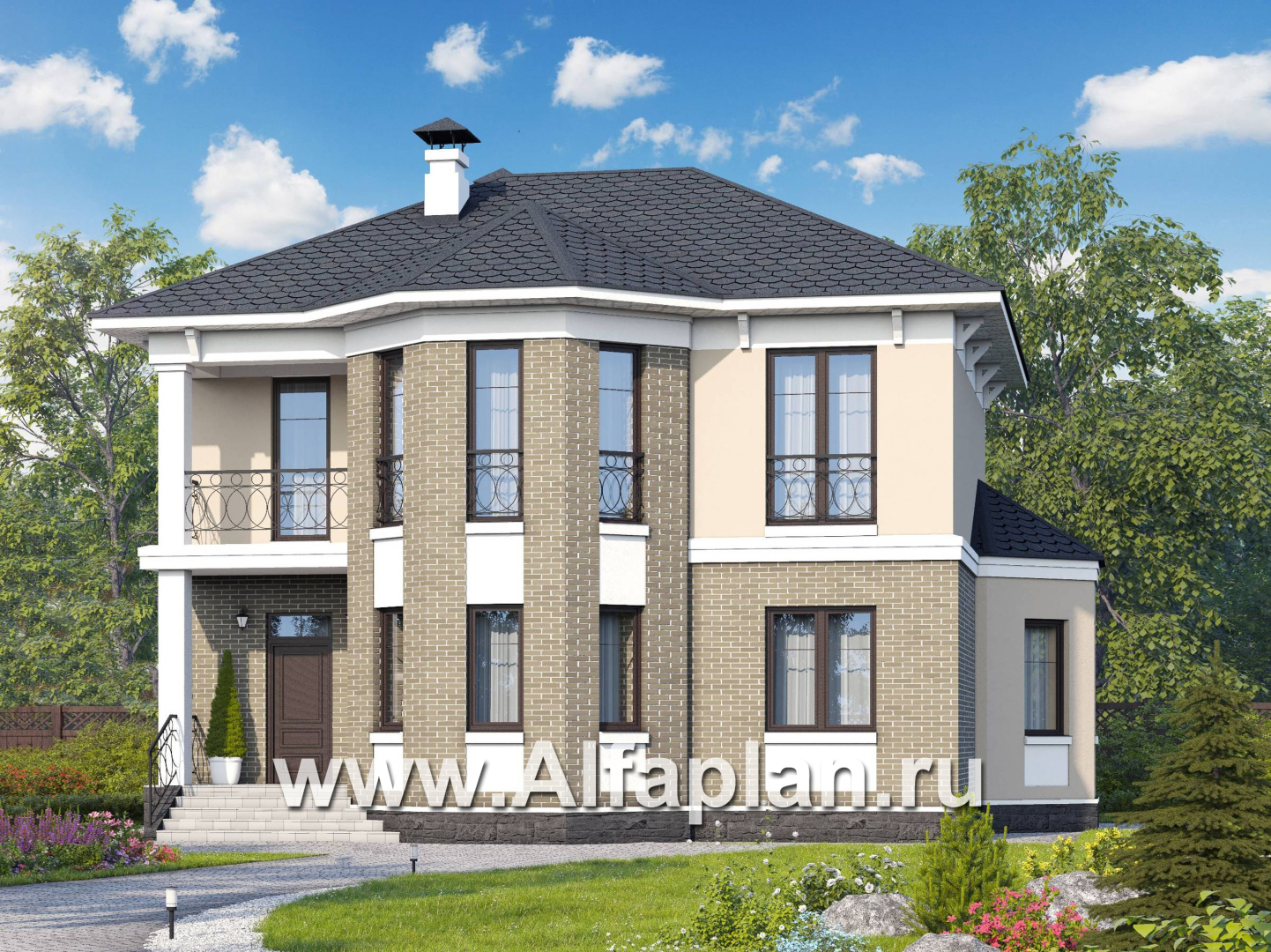 «Классика» - проект двухэтажного дома с эркером, планировка с кабинетом на 1 эт и с террасой