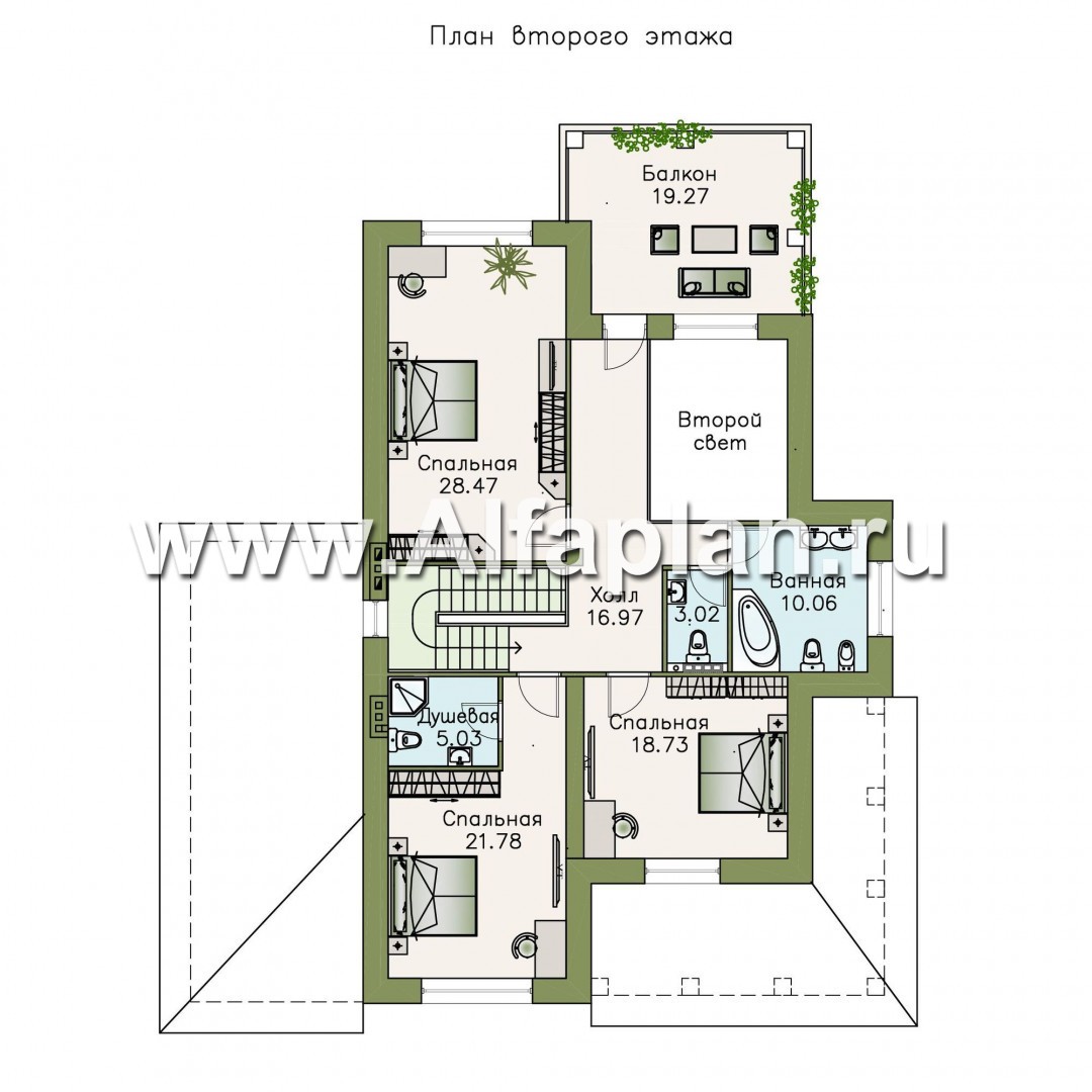 Верхний этаж — «ночная» зона с 3 просторными спальными; в каждой — гардероб и рабочий стол. В хозяйской спальне собственный санузел с ванной. Кроме этого, есть холл с балконной дверью, общий санузел и ванная. Часть метража занимает второй свет.