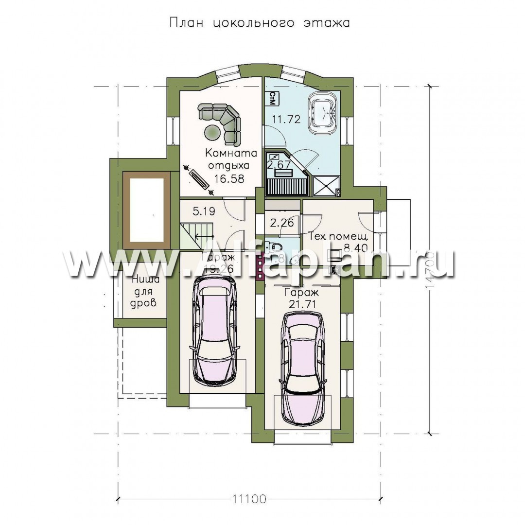 На цокольном этаже располагается два гаража, ванная комната с джакузи, комната для отдыха и техническое помещение. Также здесь предусмотрен компактный санузел и тамбур, в котором будет лестница на первый этаж.