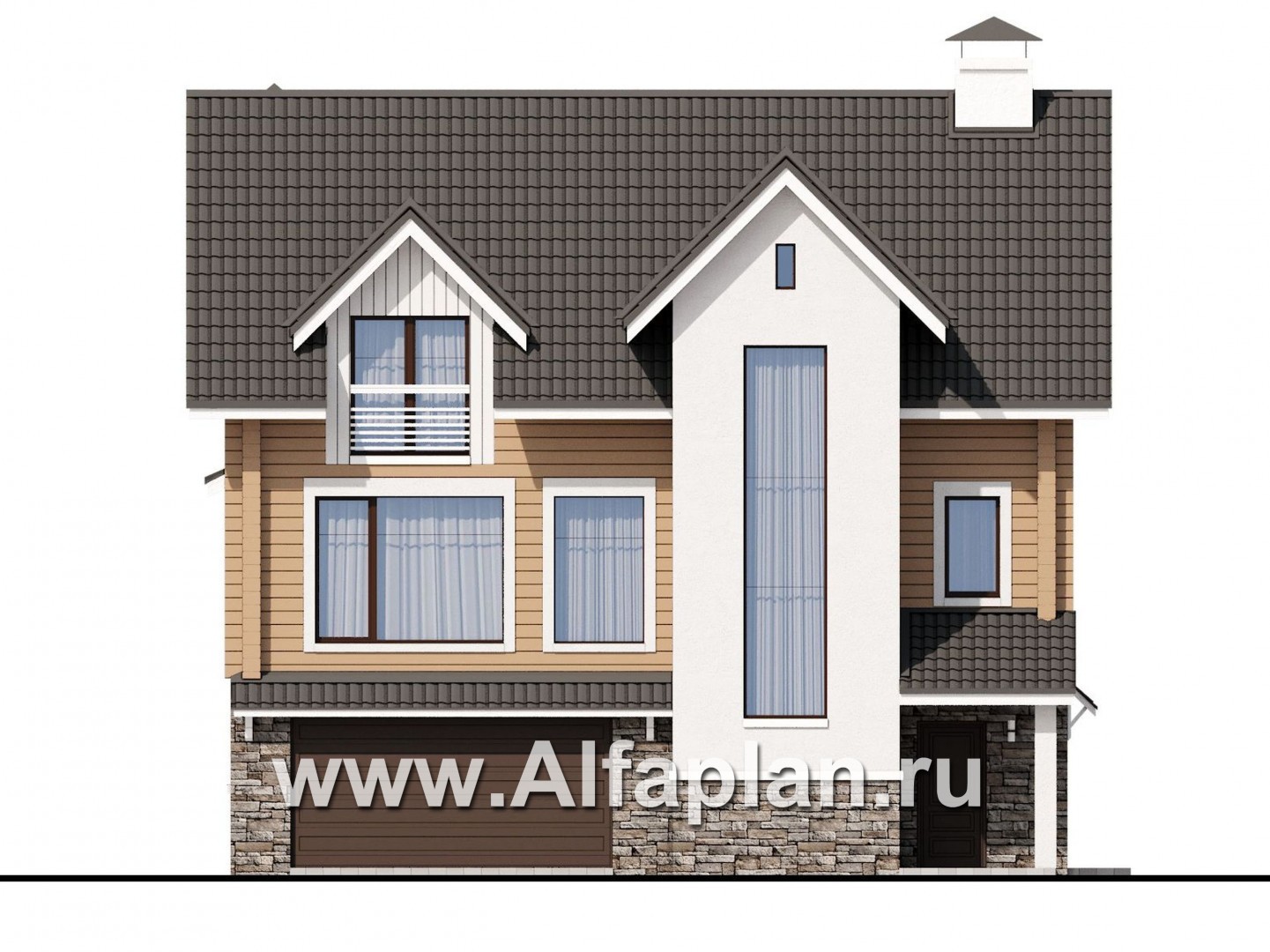 840A-S «АльфаВУД» - проект дома с мансардой, из дерева, на цоколе из кирпича, с гаражом