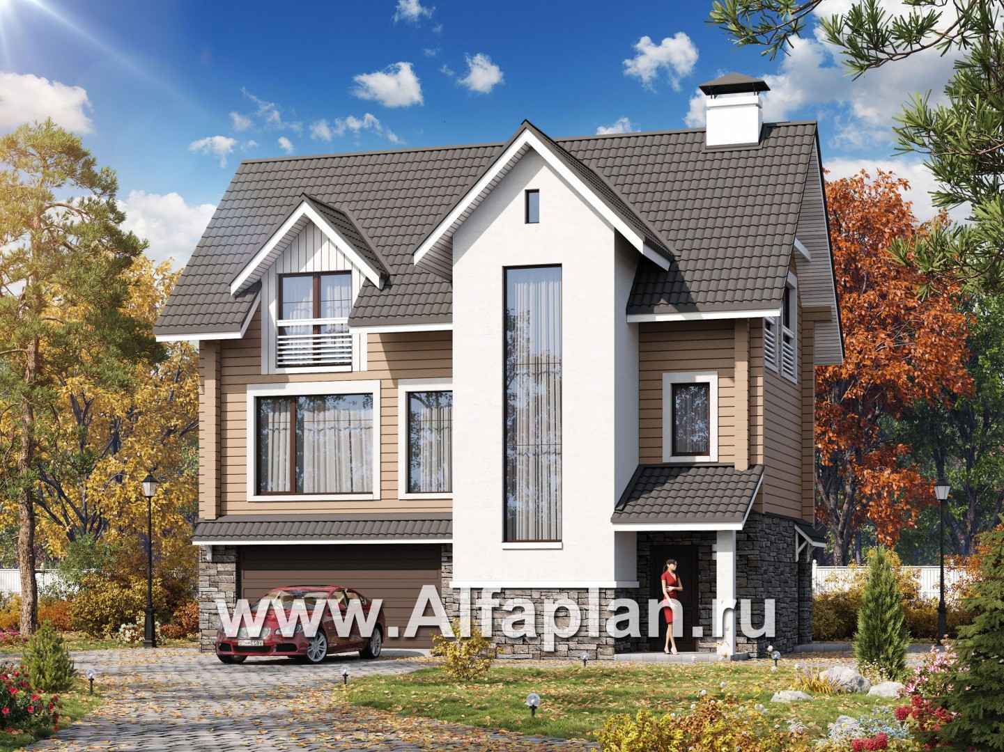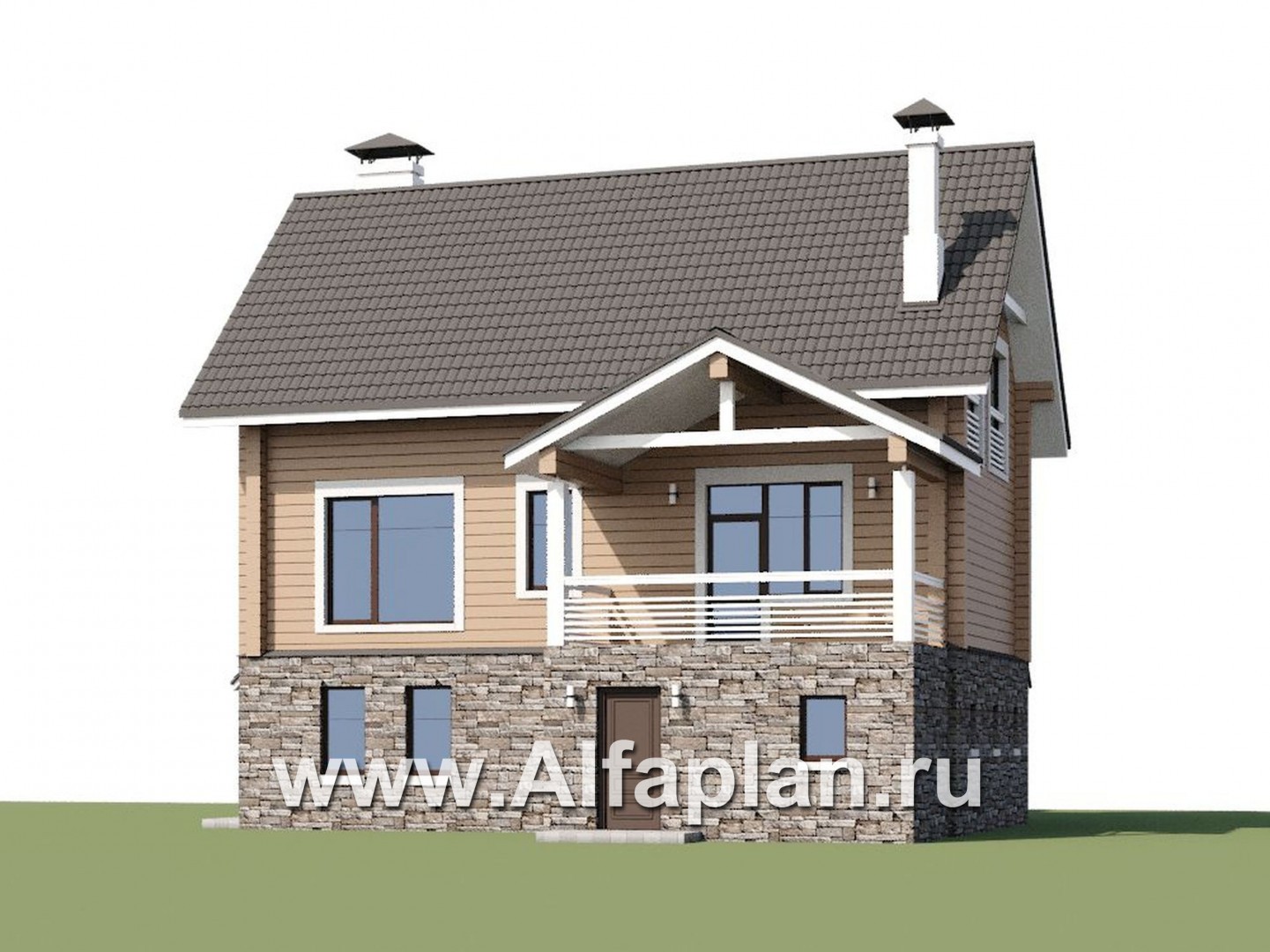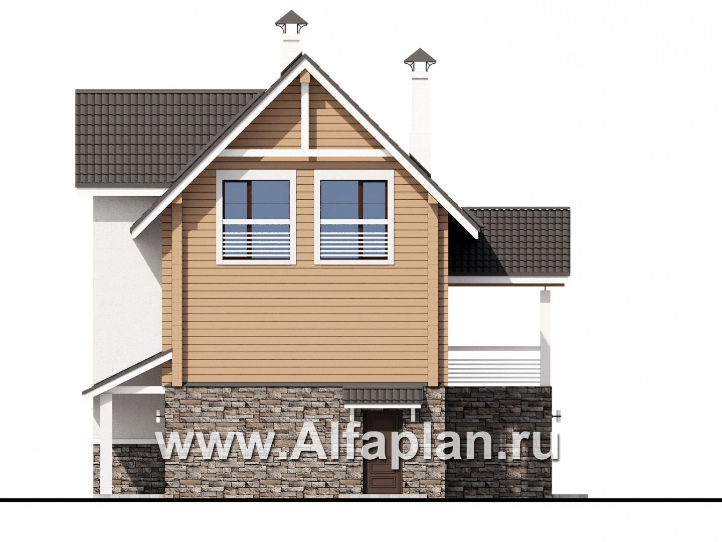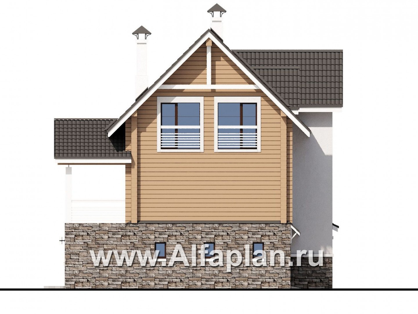 «АльфаВУД» - проект дома с мансардой, из дерева, на цоколе из кирпича, с гаражом