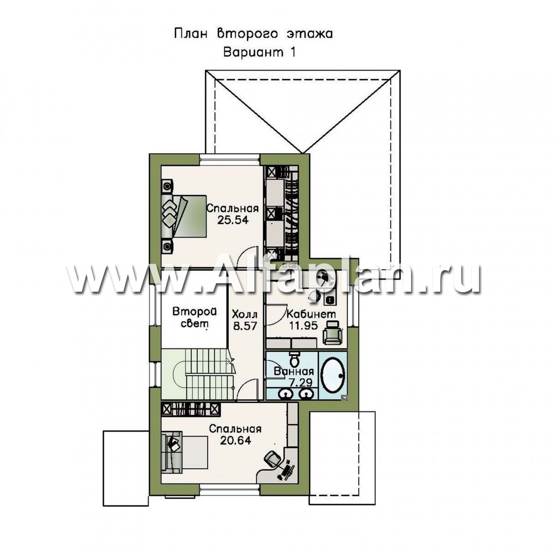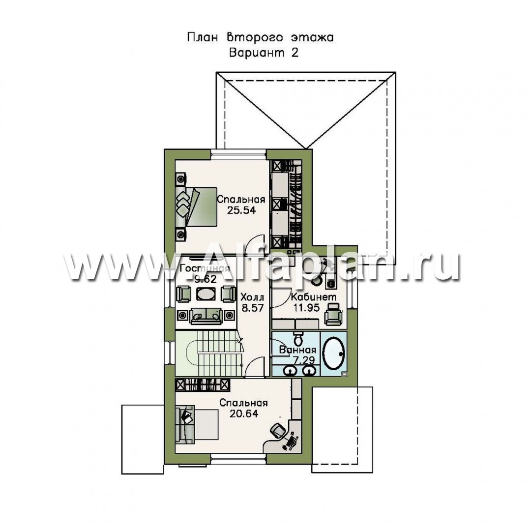 На втором этаже расположилась приватная зона, представленная двумя спальнями, не равноценными по площади, а также изолированным кабинетом. Все помещения вместе с общим санузлом сосредоточены вокруг холла со вторым светом. Существует вариант и без двухсветного пространства – в этом случае холл на втором этаже этого кирпичного (газобетонного) дома расширяется за счет дополнительного уголка отдыха.