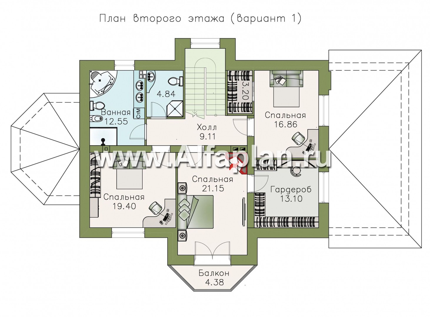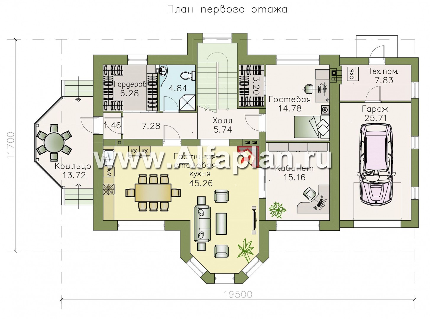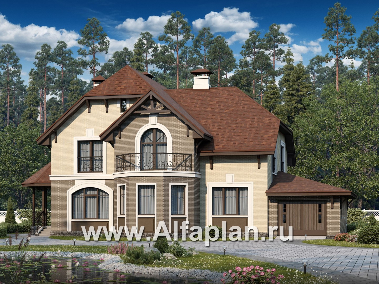 «Ясная поляна» - проект двухэтажного дома, планировка со спальней и кабинетом на 1 эт, с эркером и с гаражом на 1 авто
