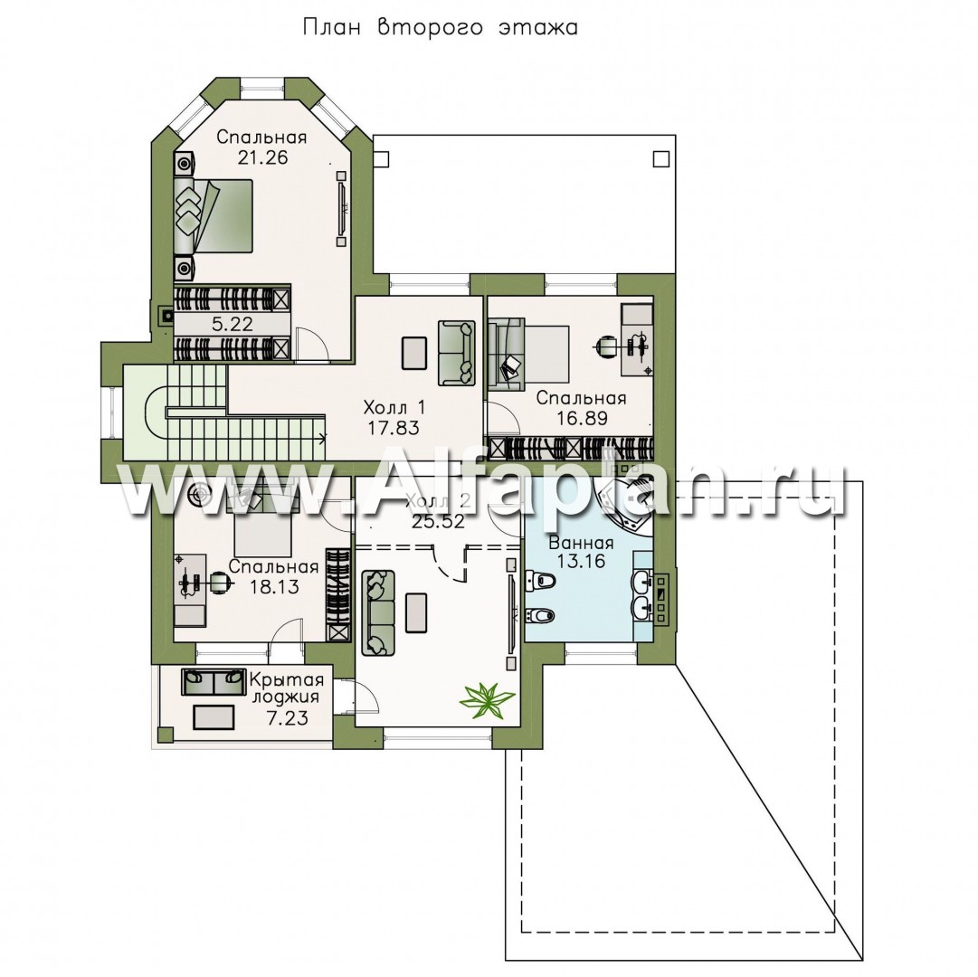На втором этаже расположены 3 спальни со встроенными шкафами. Спланированы они оригинальным образом. Поднимаясь по лестнице, мы попадаем в первый холл, куда выходят две спальни – наибольшая площадью 21 м² и детская (17 м²). Третья спальня (18 м²) имеет выход на уютную крытую лоджию. Она образует рекреацию со вторым холлом, превращенным в своебразный уголок отдыха. Здесь можно отдохнуть на мягких диванчиках, посмотреть кинофильм, почитать, послушать музыку.