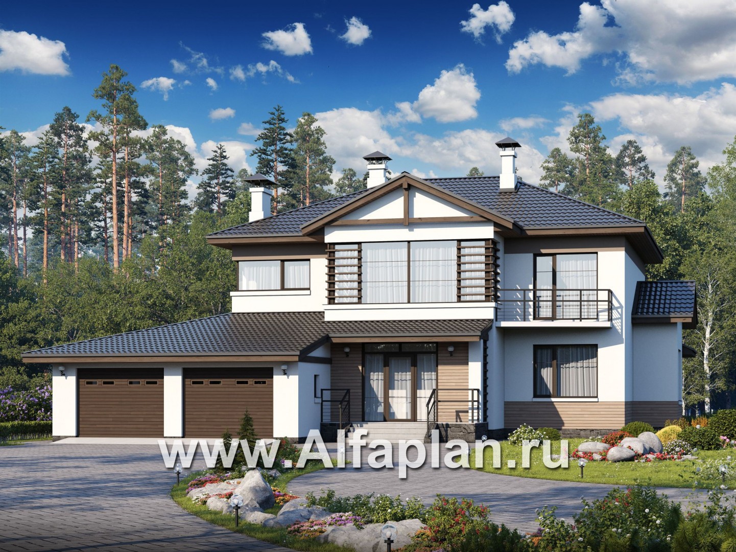 «Аутентик» - проект двухэтажного дома, с террасой и балконом, планировка с лестницей в центре, с нарадом на 2 авто