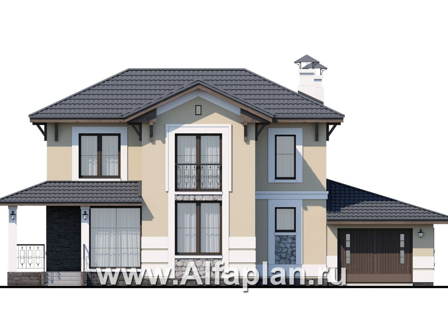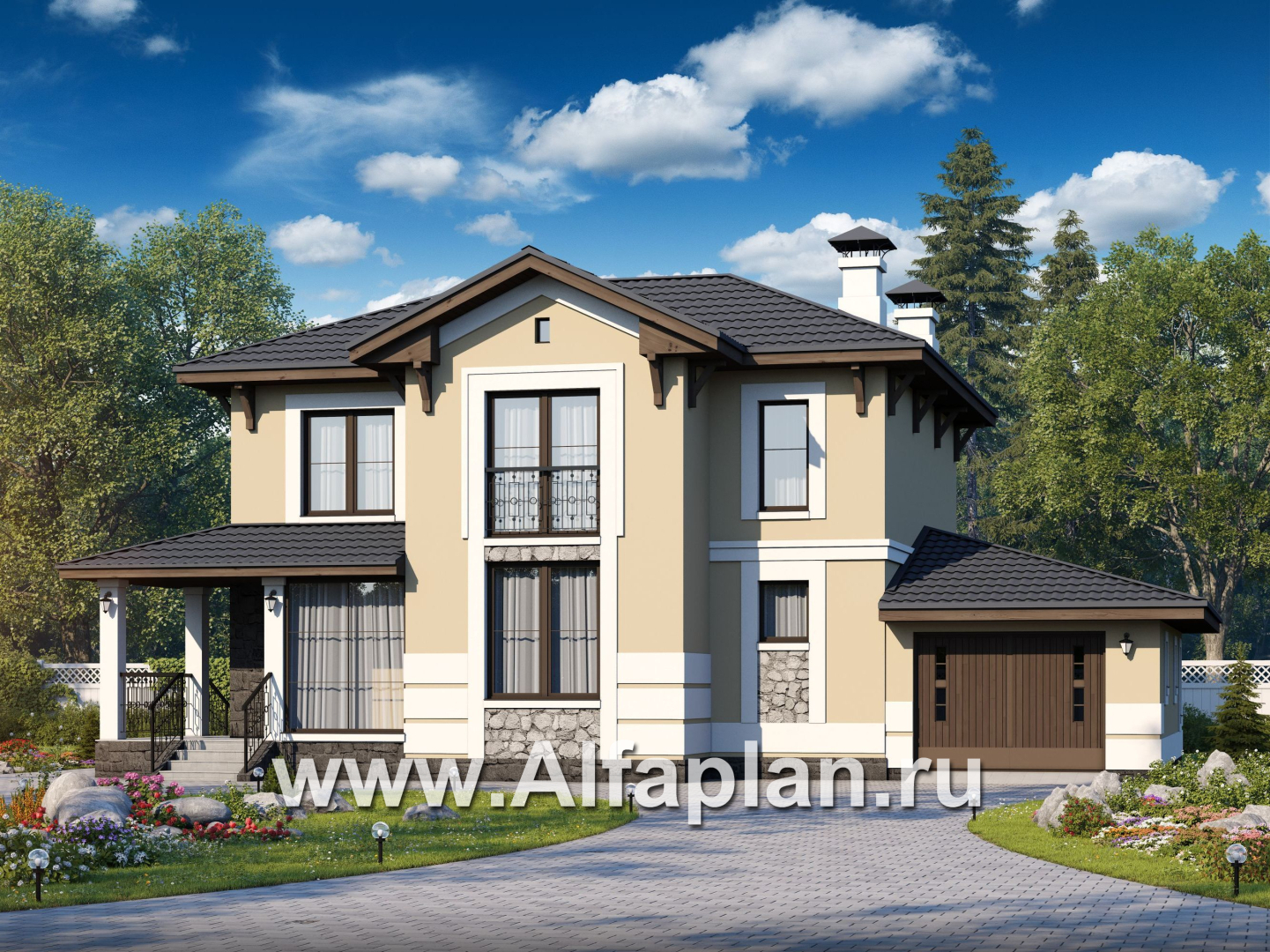 «Невский стиль» - проект двухэтажного дома из кирпича, с гаражом на 1 авто, в стиле эклектика