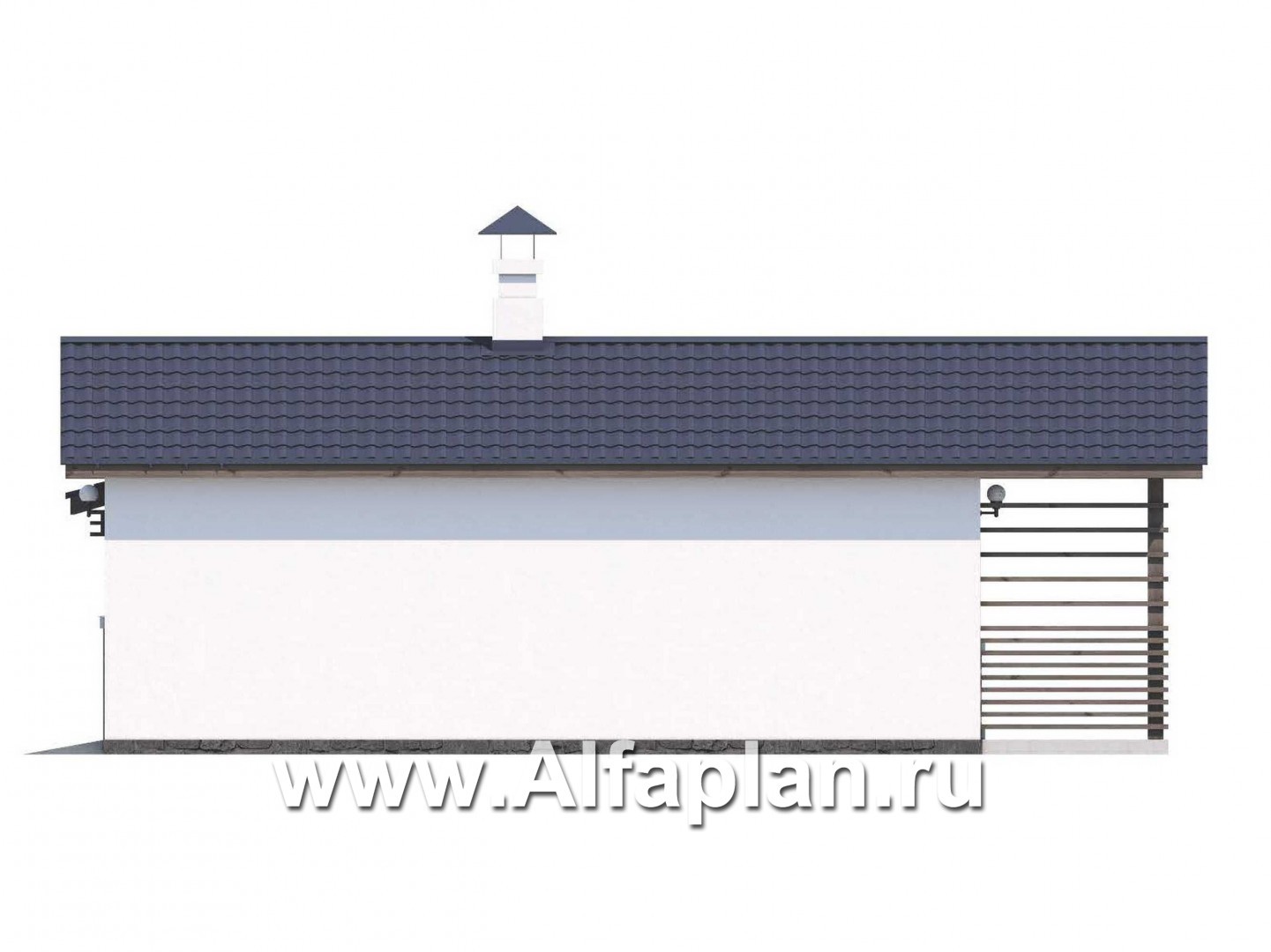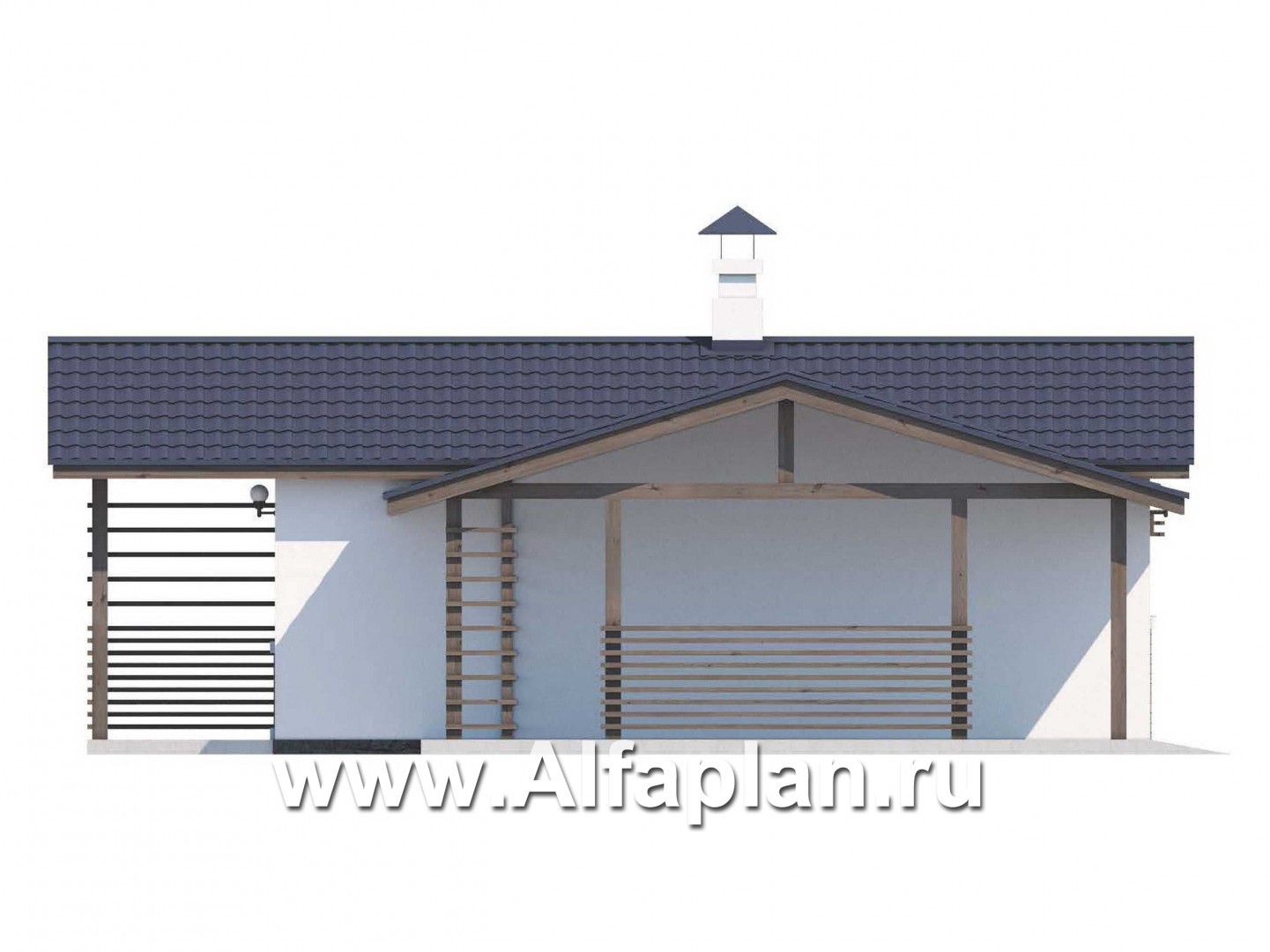 Открытая часть хозблока декорирована деревянными решетками, которые визуально отделяют пространство под навесом от участка. Вход в отдельную большую кладовую площадью около 7 м2 находится сзади. В теплые помещения можно попасть через дверь позади гаража.