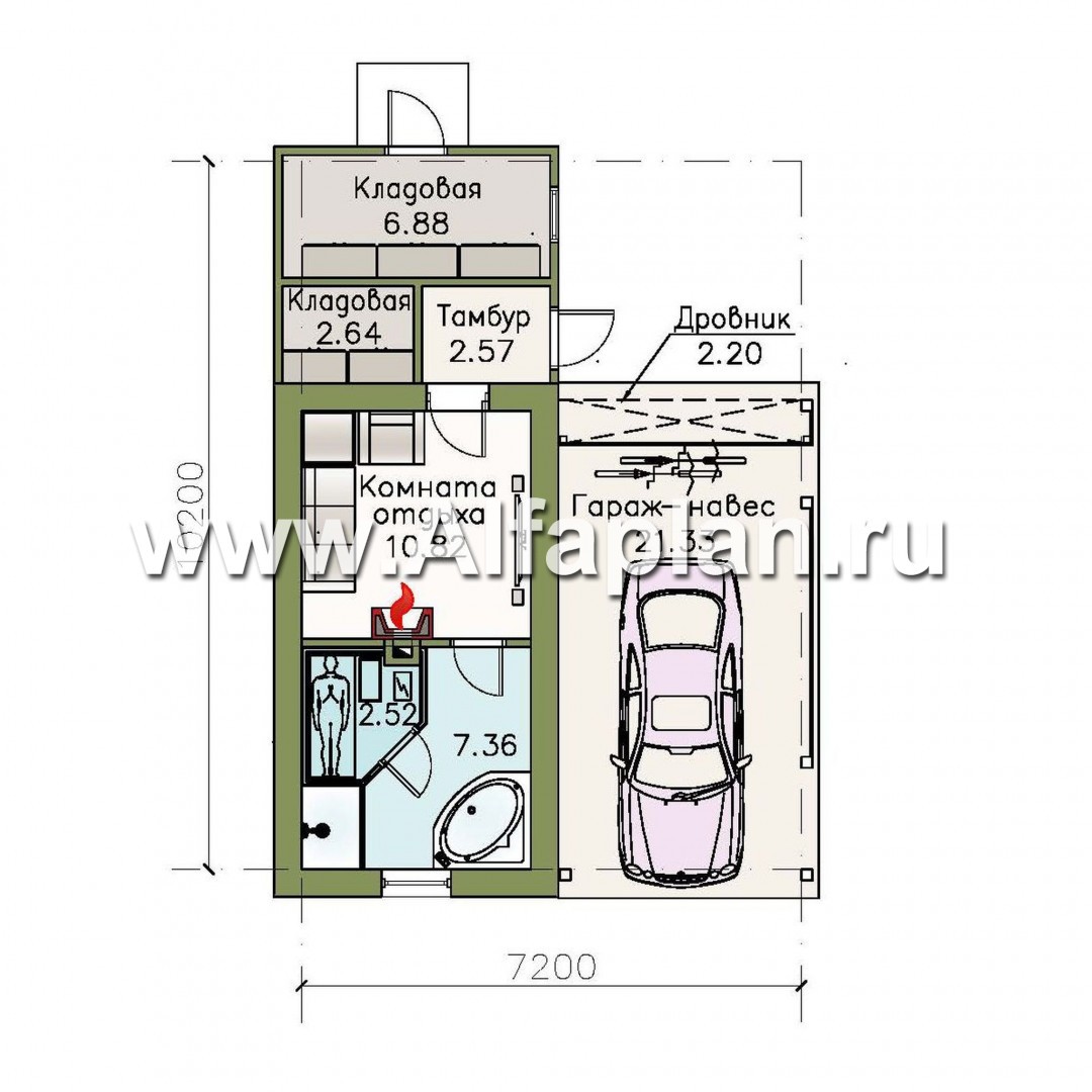 Маленький тамбур на входе позволяет сохранять тепло. Из него ведут две двери: прямо – в малую кладовую, налево – в жилую, теплую часть блока. Отапливаемая площадь включает комнату отдыха и ванную.
