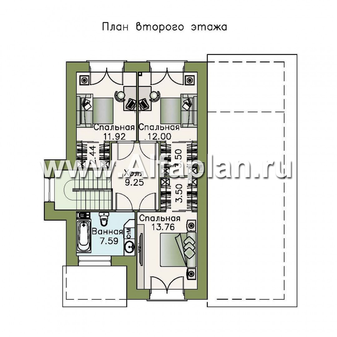 Второй этаж этого проекта коттеджа в основном отдан под помещения приватной группы: это три спальни, одна из которых является изолированной. Все они сосредоточены вокруг прямоугольного холла, занимающего центральное пространство этажа.