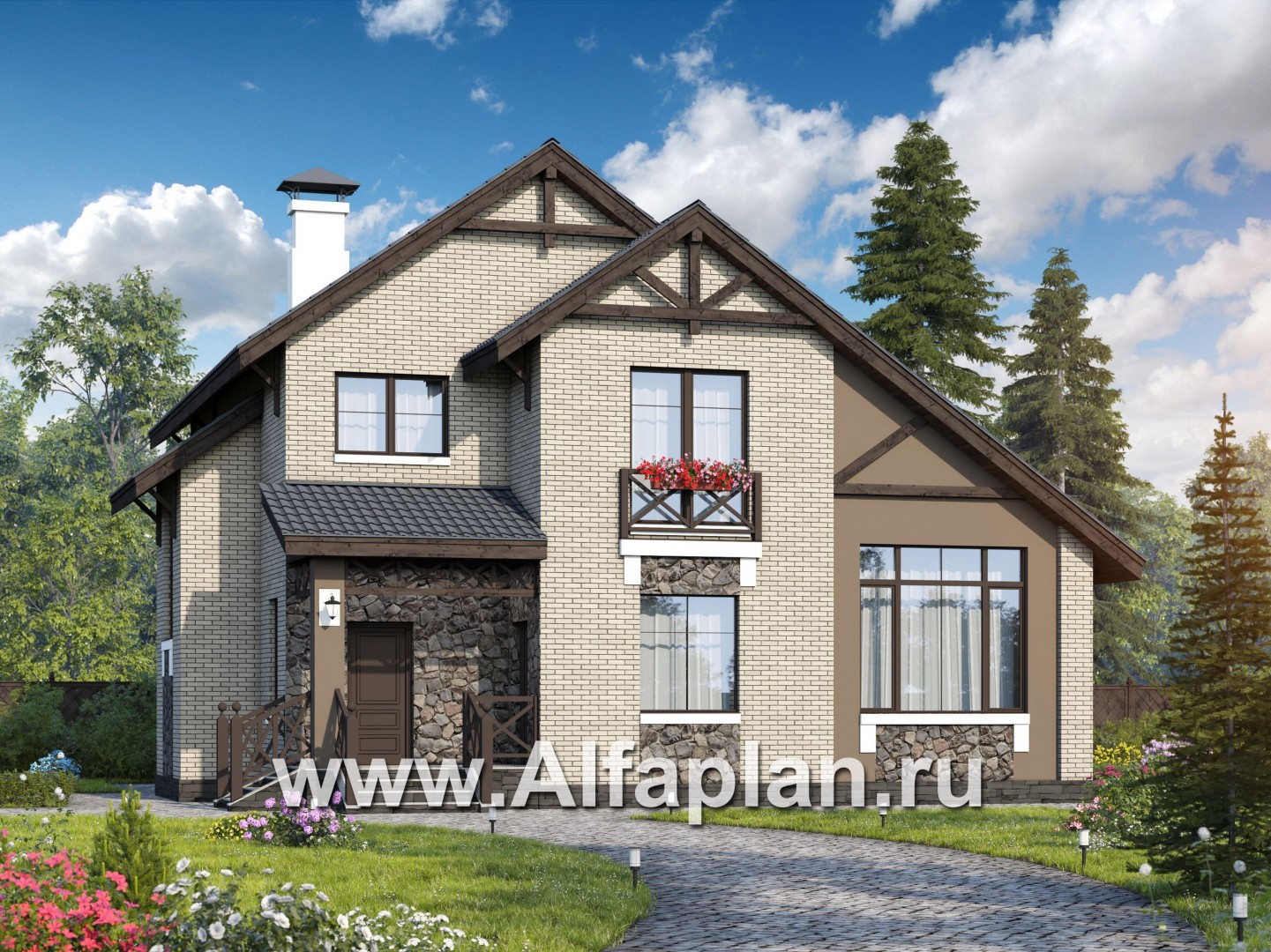 Любопытна конструкция главного фасада: по сути, основная его часть – высокий массивный эркер на три окна. Выигрышная деталь: сочетание математически организованного рисунка кирпичной кладки с подчеркнуто грубой неправильностью рустового камня. Причем использован материал двух видов – один для оформления цоколя, из второго, более фактурного, имитирующего старинную кладку, –выполнены декоративные  элементы фасада, а также отделка главного входа.