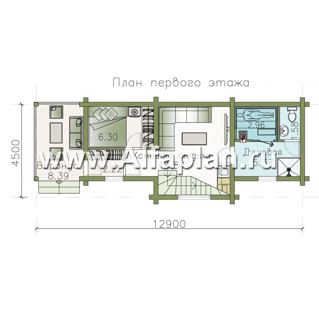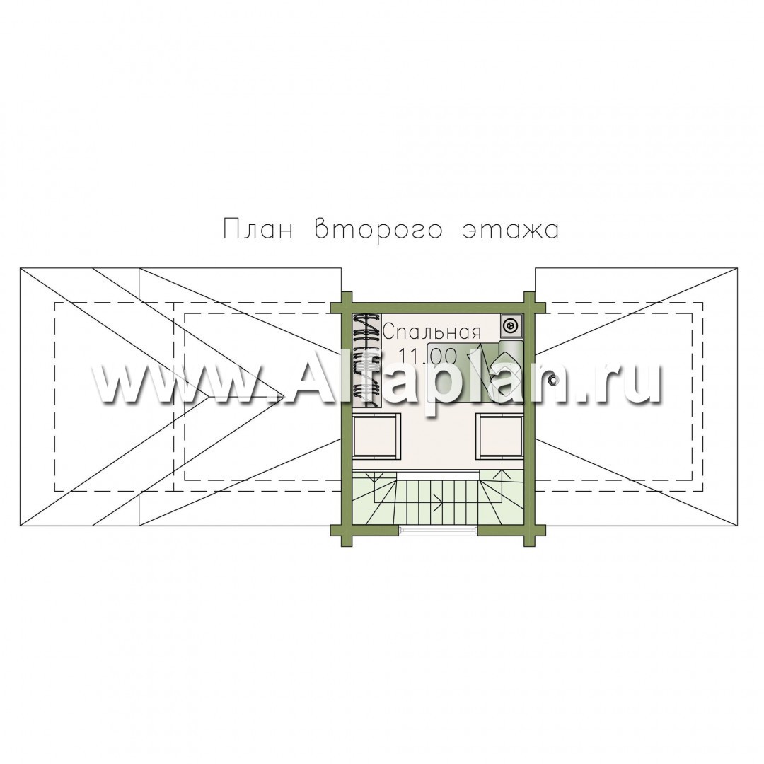 Проект бани, из дерева, из бревен, с мансардой, планировка с двумя спальнями