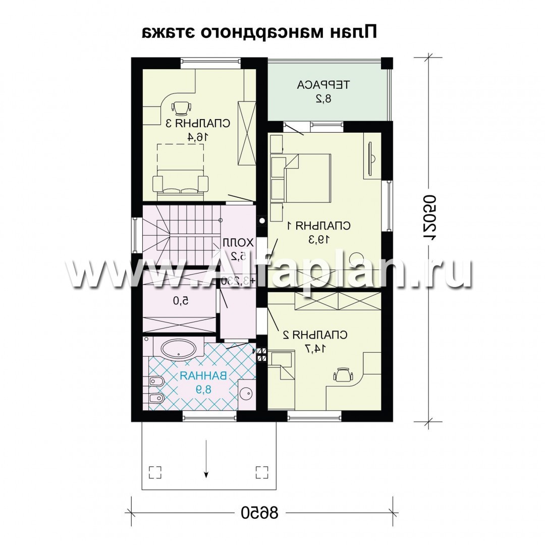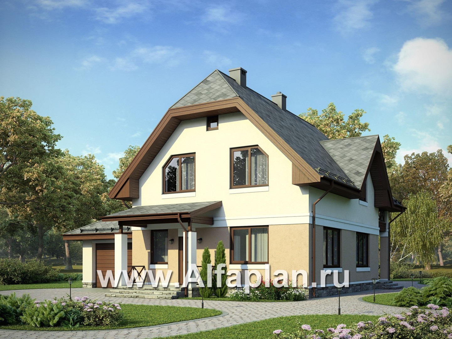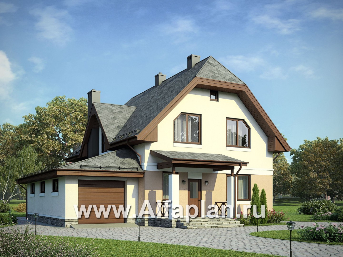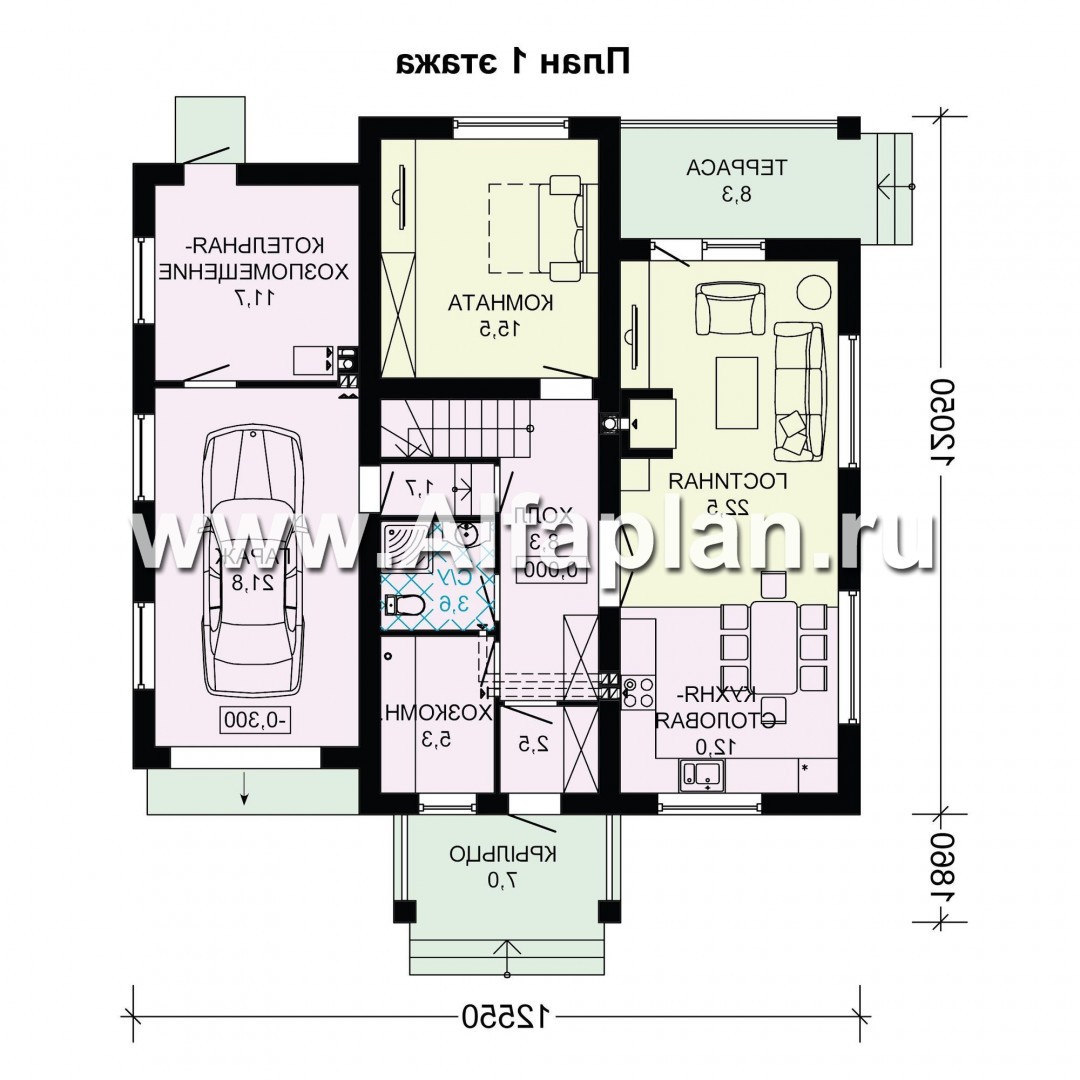 Проект дома с мансардой, планировка с террасой и кабинетом на 1 эт, с гаражом на 1 авто