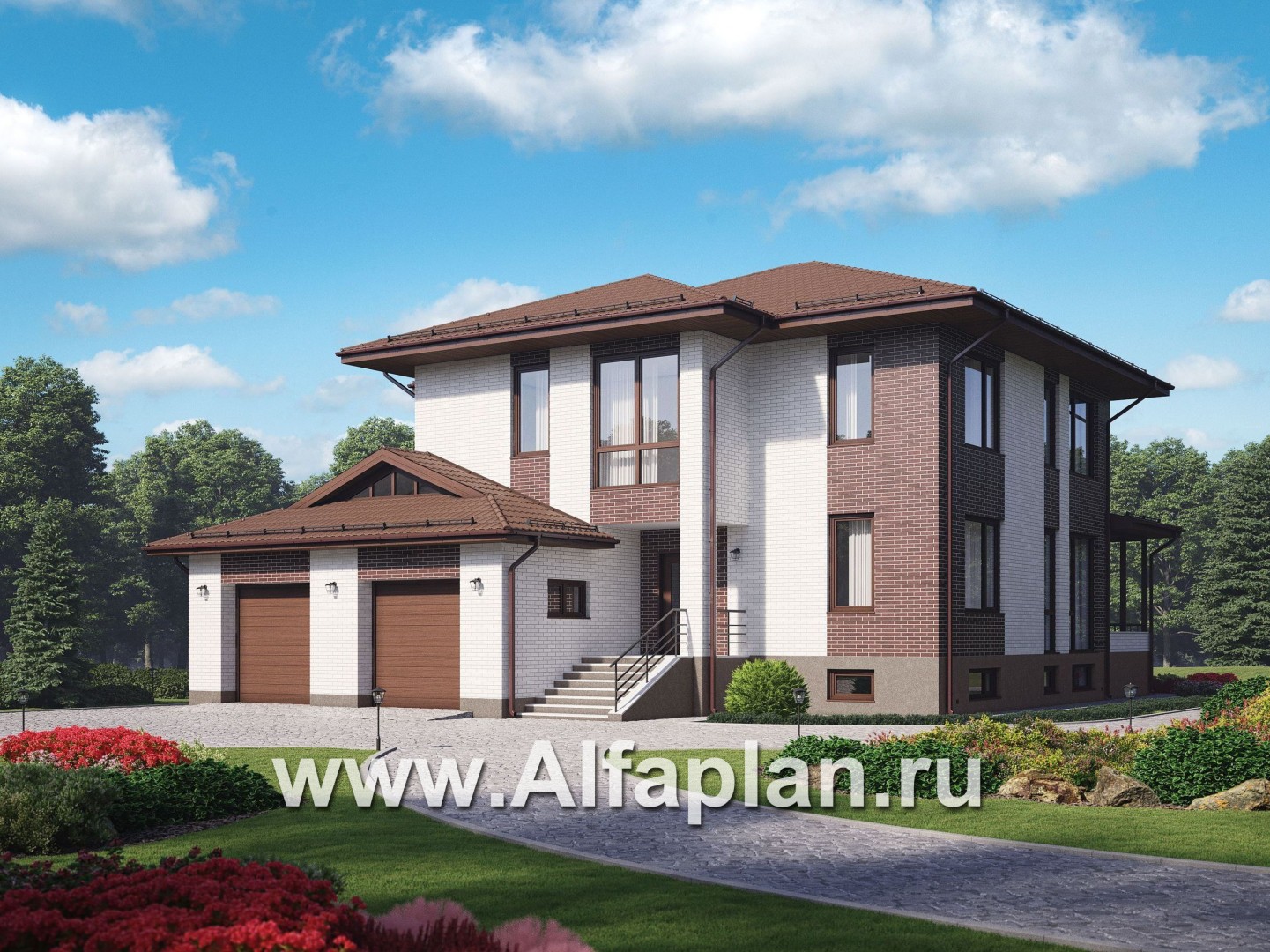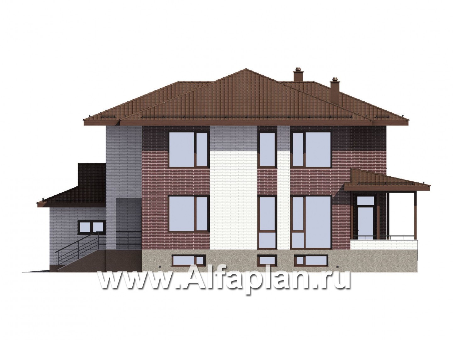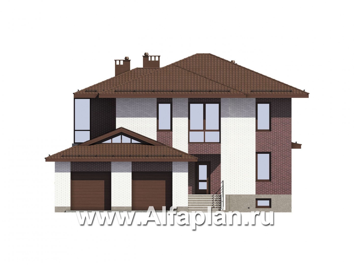 Проект двухэтажного коттеджа, планировка с кабинетом и с гаражом на 2 авто, с террасой, с цокольным этажом