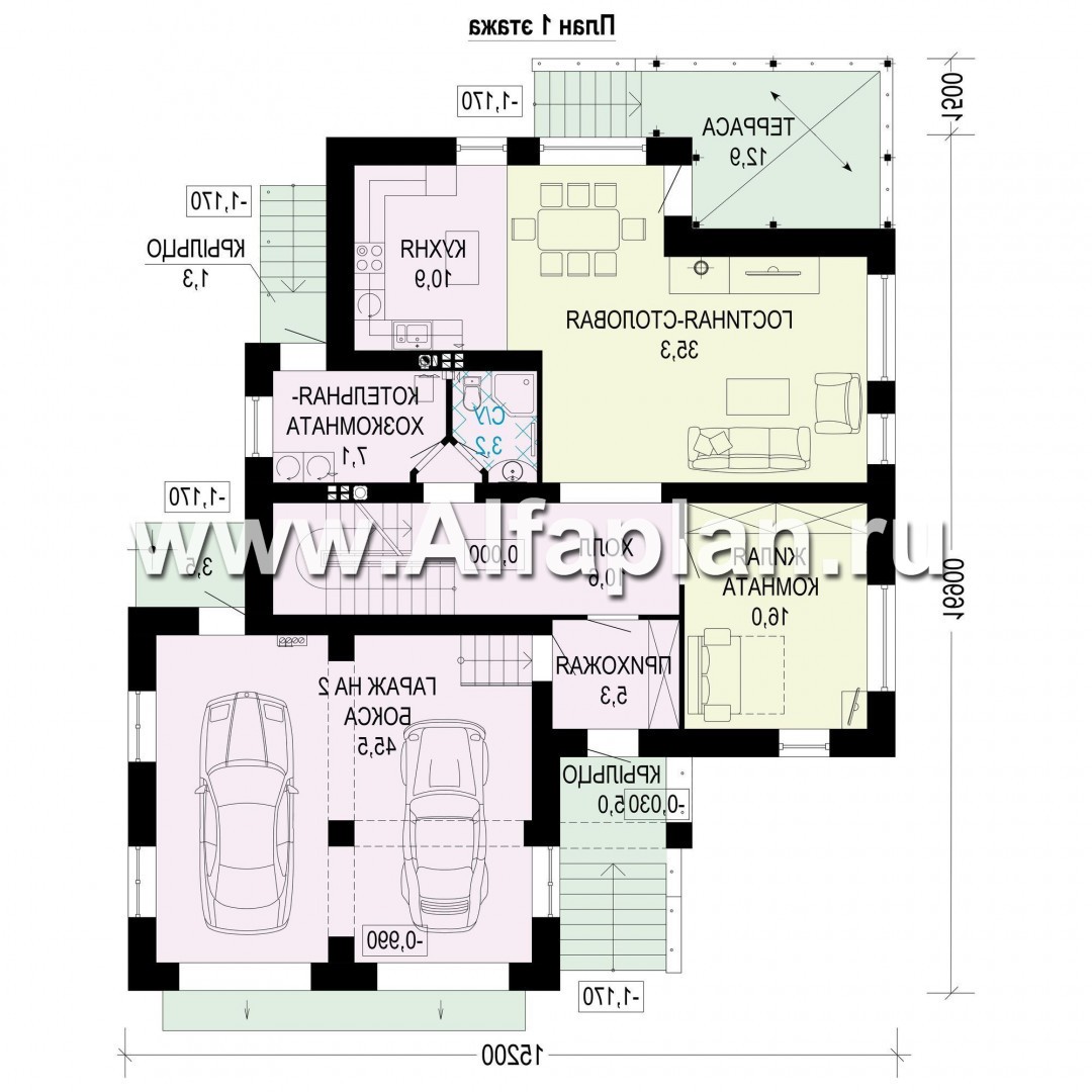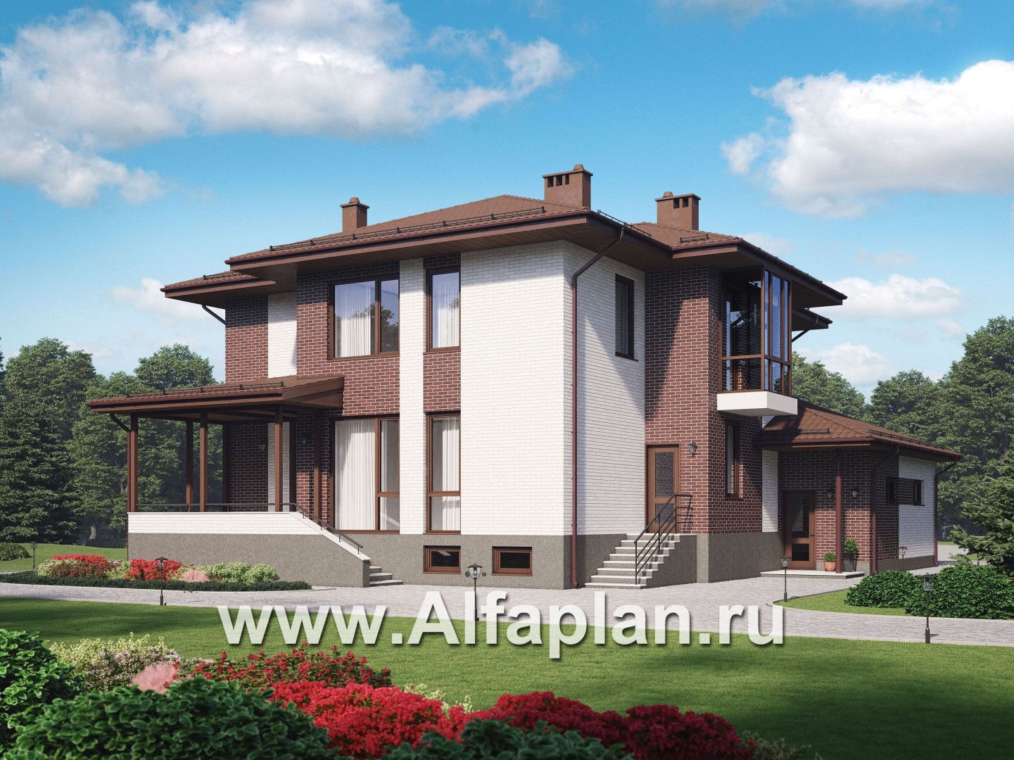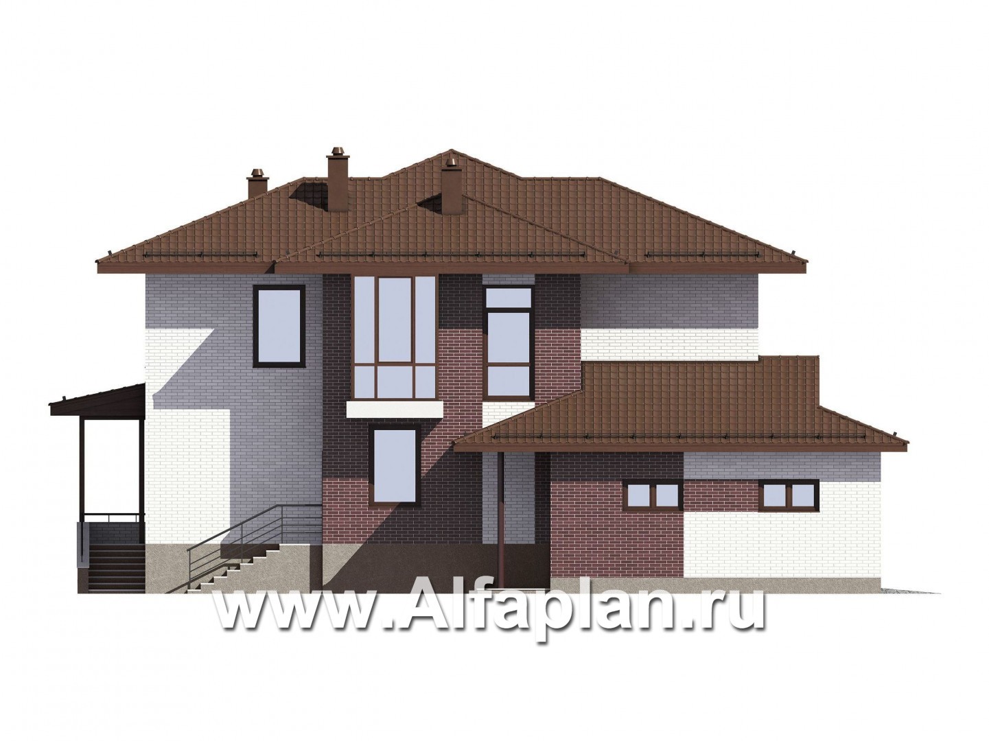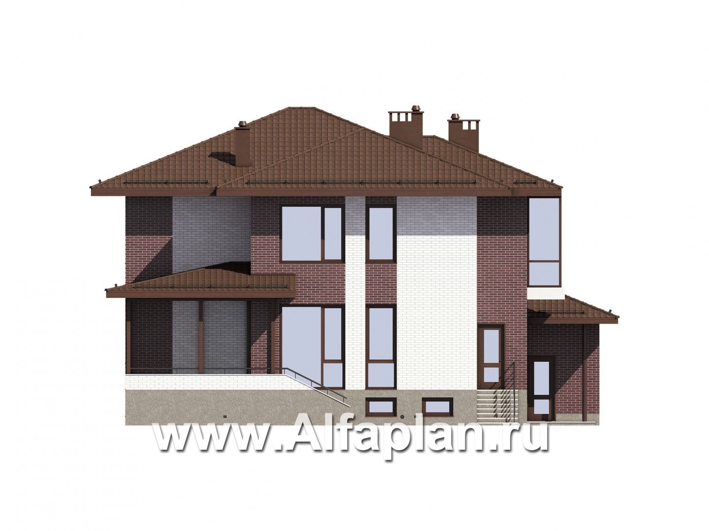 Проект двухэтажного коттеджа, планировка с кабинетом и с гаражом на 2 авто, с террасой, с цокольным этажом