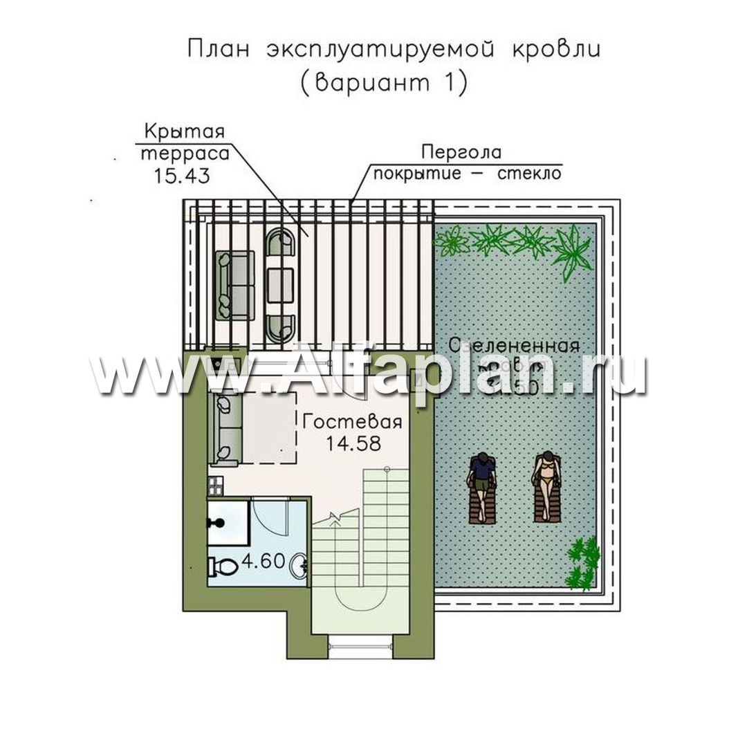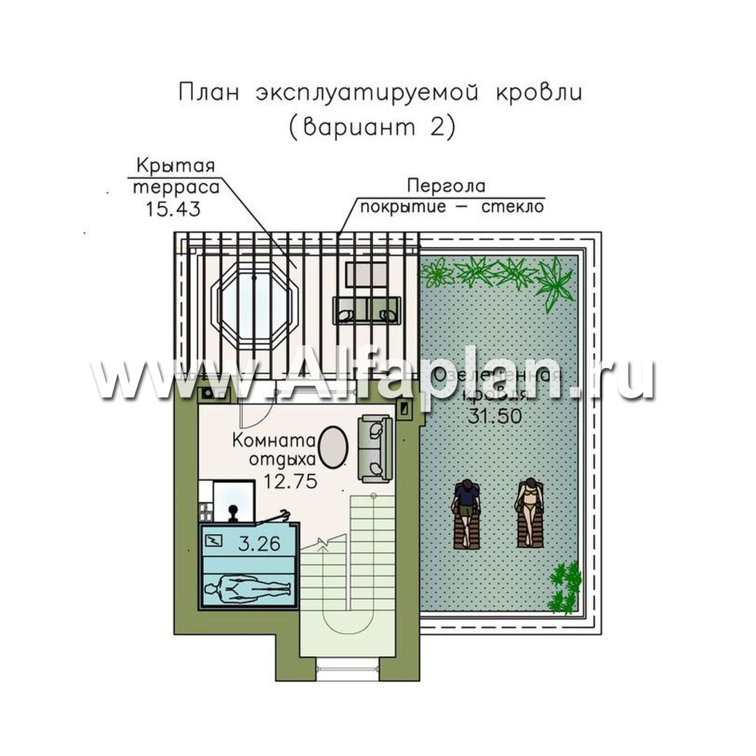 Проект дома кровлей 385А «Приоритет» - суперсовременный дом с эксплуатируемой, плоской кровлей. Одна часть кровли находится под перголой со стеклом, вторая часть кровли – зеленая.  На этом третьем уровне (этаже) дома есть вариант с жилой комнатой, и есть вариант с сауной. В этом замечательном варианте можно из сауны выйти на кровлю, посидеть под перголой, полежать на шезлонге на газоне, или… окунуться на нем в снег.