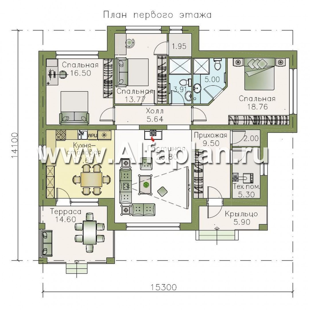 | Высота 1-го этажа | в гостиной и столовой до стропил | 3 м |