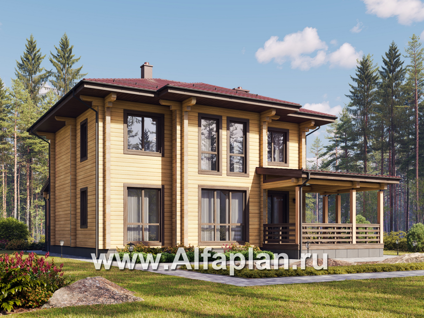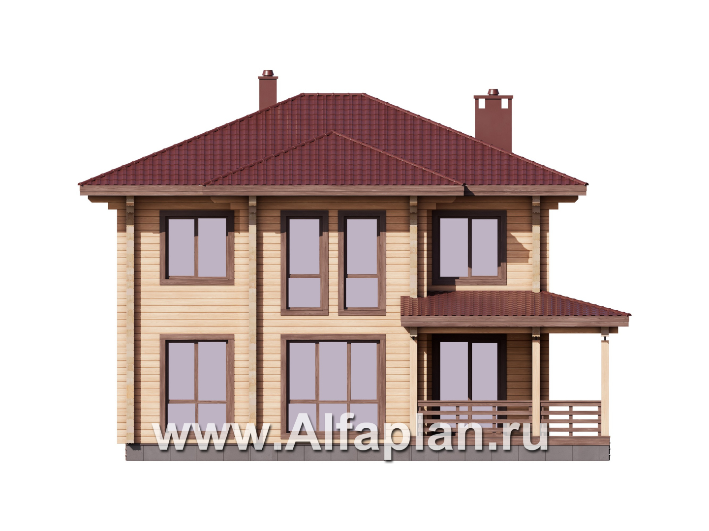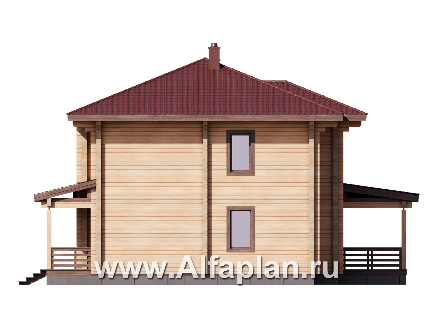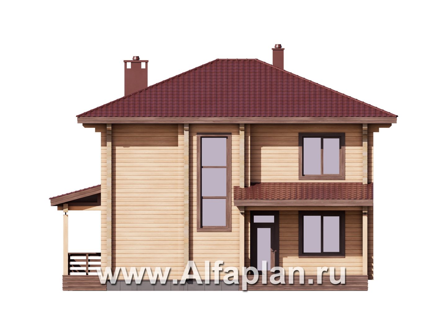 Проект двухэтажного дома из клееного бруса, планировка со спальней на 1 эт, с террасой