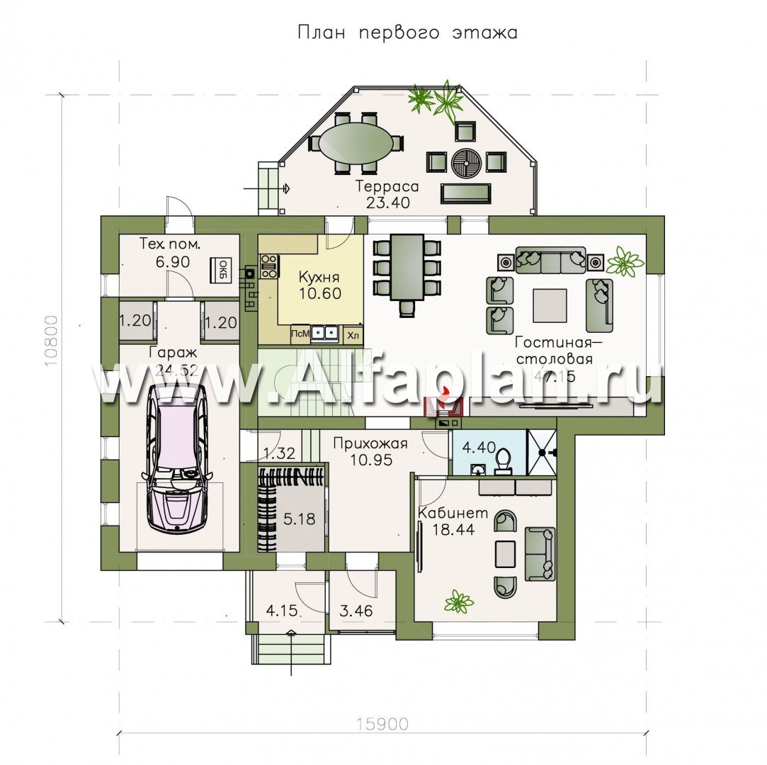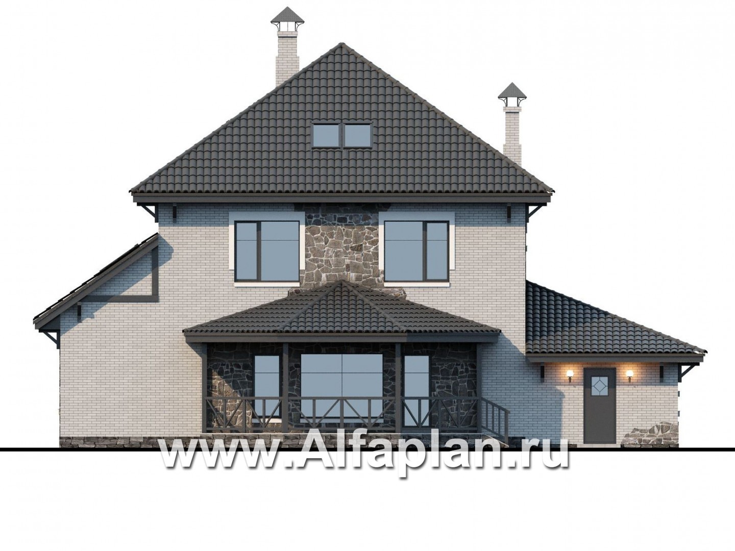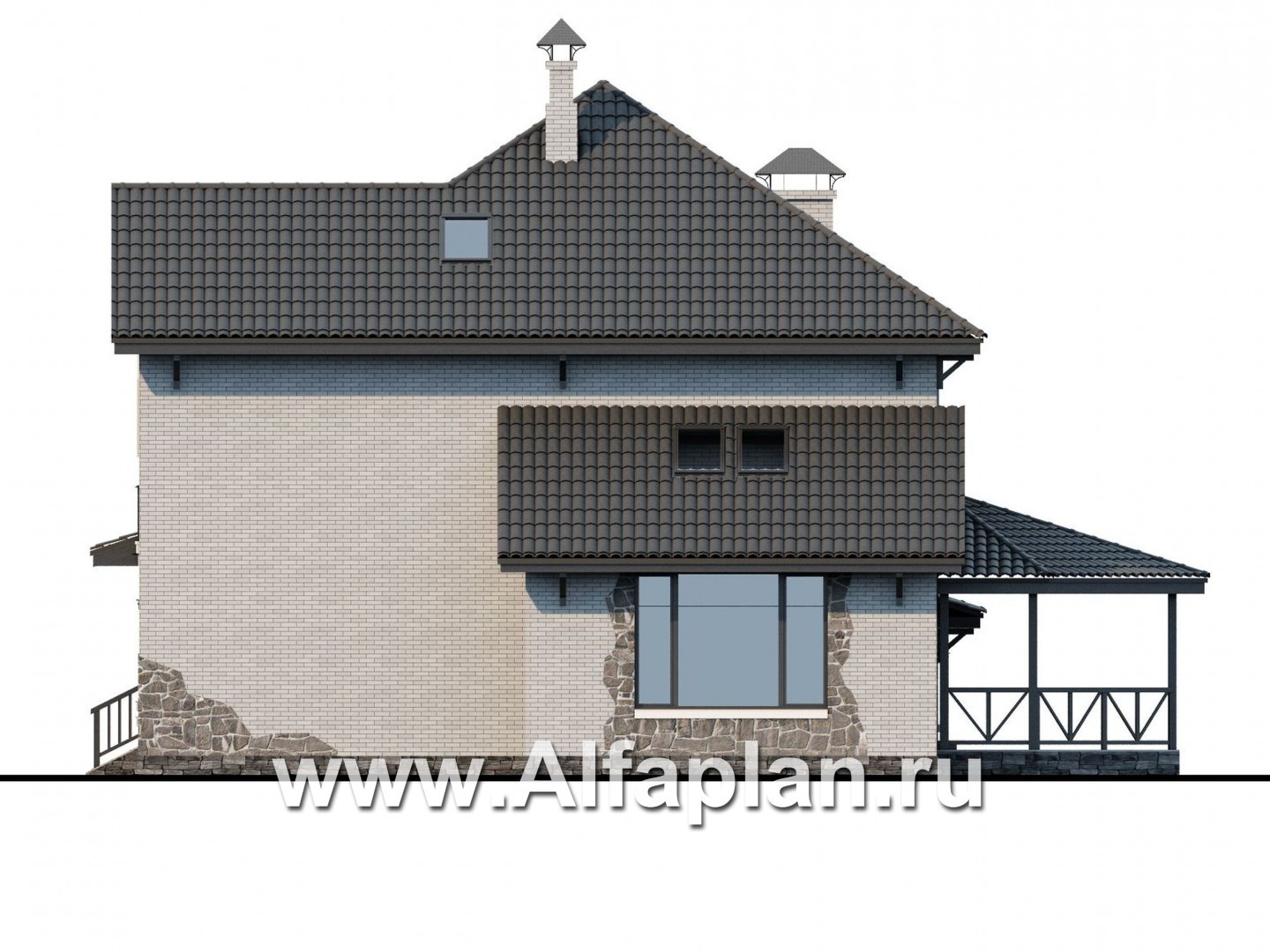 Проектом кирпичного (пено-, газобетонного) дома предусмотрено два полноценных этажа и жилая мансарда. К главному фасаду примыкает обычная связка «центральный вход – тамбур – прихожая с гардеробной», а также изолированный кабинет. Из прихожей можно попасть в гостевую зону, представленную просторной гостиной-столовой с камином. Внутри нее перегородками выделено пространство под кухню. Кухня, в свою очередь, сообщается с открытой террасой, выполненной в форме многогранника.