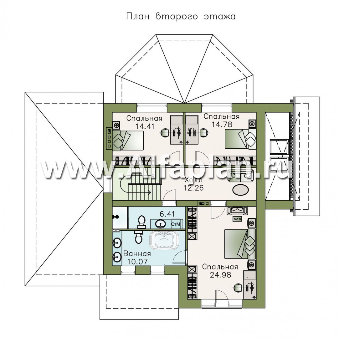 Пространство второго этажа, согласно проекту дома из кирпича (газо-, пенобетона), отдано под приватную зону. Она представлена тремя спальнями, причем одна из них оборудована собственной ванной комнатой. Кроме того, на этаже есть еще один санузел общего пользования. Все помещения сгруппированы вокруг холла, в котором нашлось место для уголка отдыха.